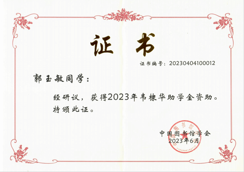 我校学生郭玉敏荣获中国图书馆学会韦棣华助学金